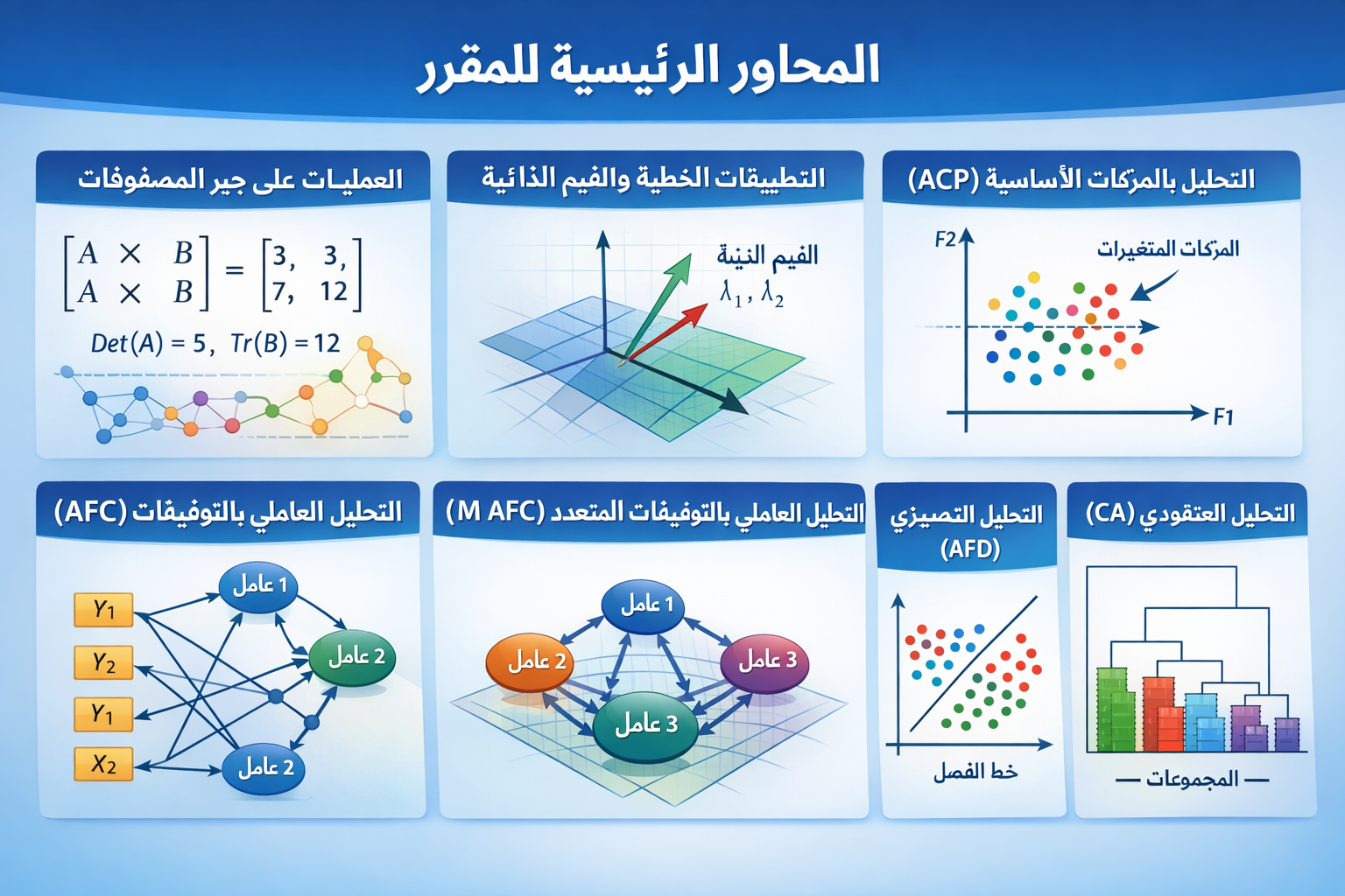 يهدف هذا المقرر إلى تمكين الطالب من التعامل مع البيانات الضخمة والمتعددة المتغيرات من خلال استراتيجيات الاختزال والتصنيف. يركز المساق على الجانب التطبيقي المباشر، حيث يتم دمج المفاهيم الإحصائية المعقدة بالمهارات التقنية باستخدام برنامج SPSS، مما يتيح للطالب القدرة على تحويل البيانات الخام إلى رؤى ومعلومات ذات قيمة علمية وعملية.